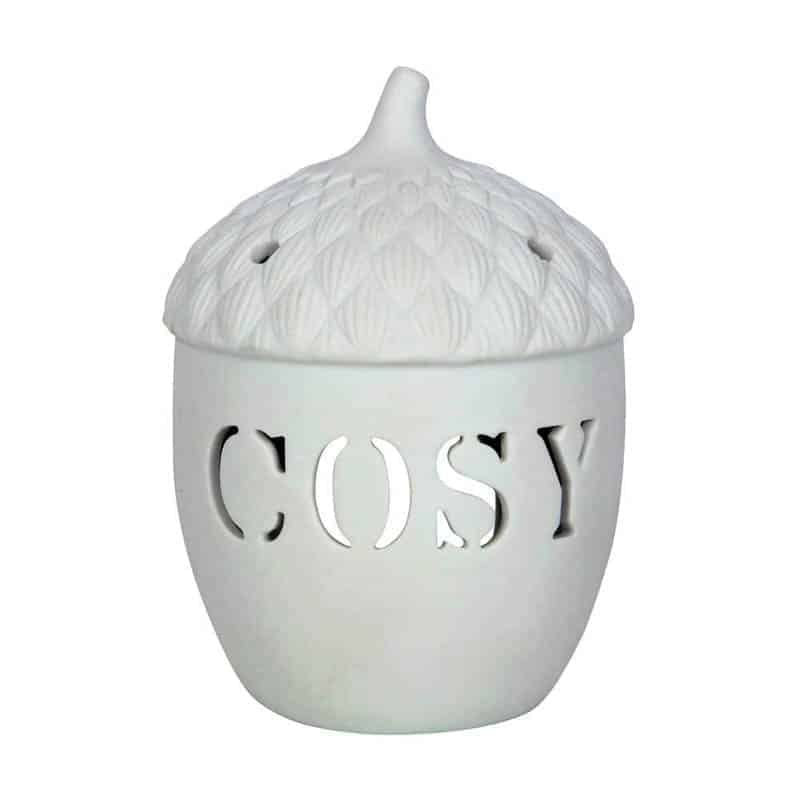 Φτιάξτε μια ζεστή ατμόσφαιρα αυτό το φθινόπωρο με αυτο το κεραμικό καυστήρα σε σχήμα βελανιδιού. Το “άνετο” αποκομμένο κείμενο τελειώνει αυτό το συγκρατημένο, δασικό σχέδιο.