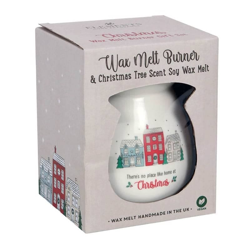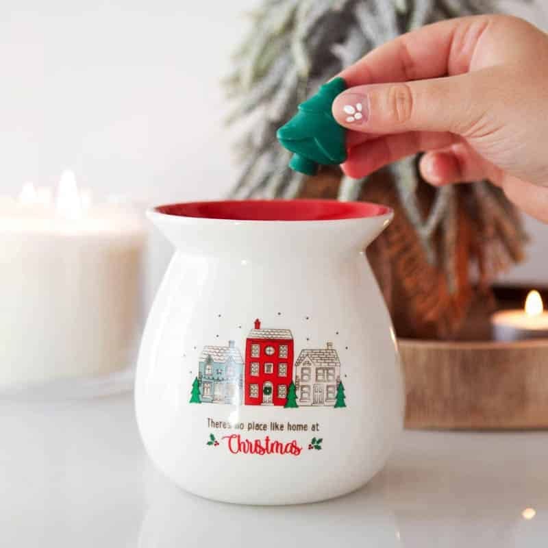 Αυτό το υπέροχο σετ δώρου περιλαμβάνει ένα κεραμικό θερμαντήρα και ένα αρωματικό wax melt σε σχήμα χριστουγεννιάτικο δέντρο. Ο θερμαντήρας κεριού διαθέτει μια γραφική σκηνή χωριού και ένα κείμενο που λέει «Δεν υπάρχει μέρος σαν το σπίτι τα Χριστούγεννα». Τοποθετήστε το ζωντανό πράσινο wax melt χριστουγεννιάτικου δέντρου μέσα στο κόκκινο πιάτο πάνω από το θερμαντήρα κεριού για να απελευθερώσετε το εορταστικό άρωμα σε όλο το σπίτι.