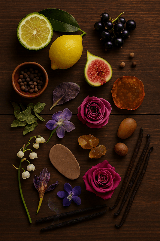 - Μεσαίες νότες – Ambrette, σύκο, τριαντάφυλλο, ίρις, βιολέτα, κρίνο της κοιλάδας