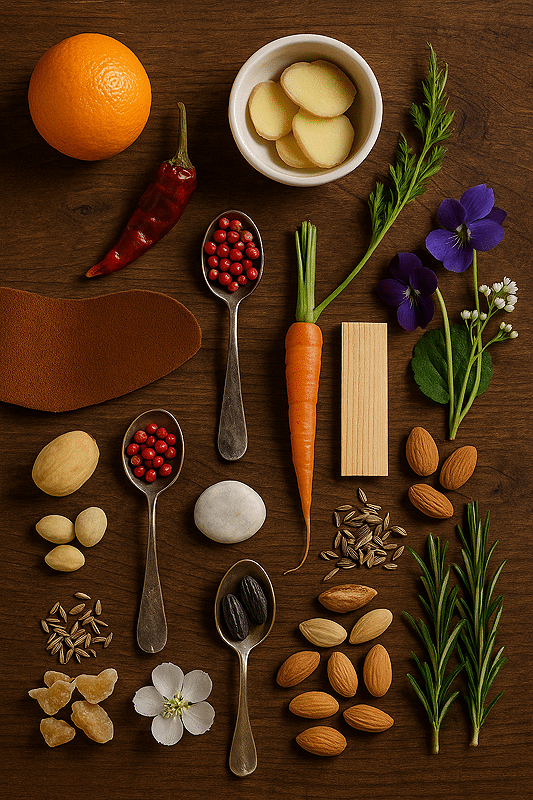 - Νότες Βάσης – Δέρμα, μόσχος, σανταλόξυλο, αμπρέτ, τόνκα
