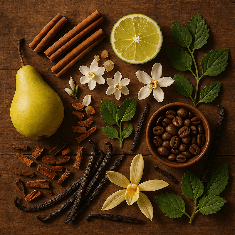 - Νότες Βάσης Βανίλια Μαδαγασκάρης, Βανίλια Μπέρμπον, απόλυτη βανίλια, Καφές, ορχιδέα βανιλια και πατσουλί.
