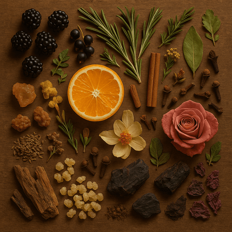 Από την πρώτη στιγμή, οι ζουμερές νότες βατόμουρου και μαύρης σταφίδας ανοίγουν με σκοτεινή, εθιστική ένταση. Το λαβδάνο και το δενδρολίβανο προσθέτουν βάθος και ρητινώδη δύναμη, ενώ το πορτοκάλι και το davana χαρίζουν μια φωτεινή, μεθυστική αντίθεση. Στην καρδιά, το θυμίαμα συναντά τις πικάντικες νότες κανέλας, γαρύφαλλου και φύλλου δάφνης, δημιουργώντας μια αύρα επιβλητικής κομψότητας. Το σκωτσέζικο σπάρτο φέρνει γήινη, μελένια ζεστασιά, ενώ η τριανταφυλλιά αναδύεται διακριτικά, μαλακώνοντας τις αιχμηρές πινελιές των σπόρων σέλινου, που προσθέτουν πράσινο, πιπεράτο τόνο.