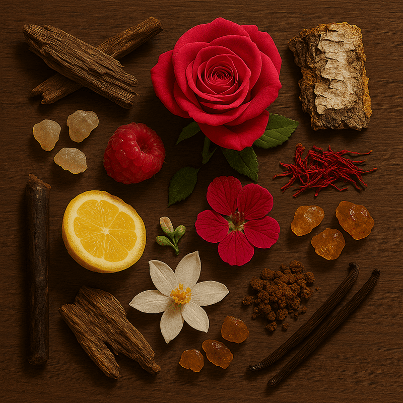 - Το άρωμα περιέχει Ξυλαλόη (Ουντ), θυμίαμα, τριαντάφυλλο, βατόμουρο, Σημύδα, σαφράν, Βενζόη, αμπερόξυλο, Γεράνι.