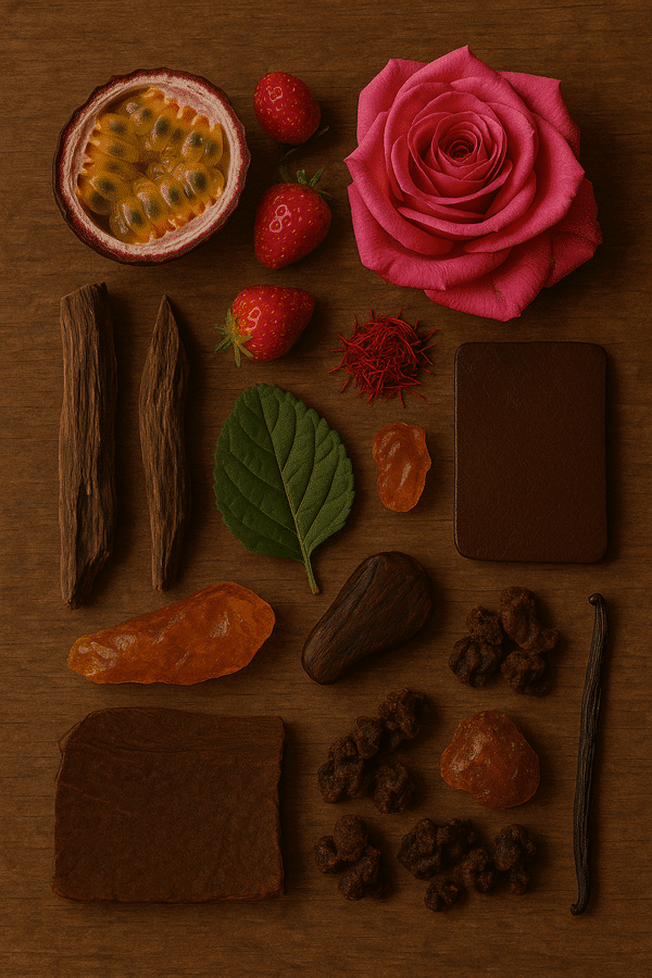 - Κορυφαίες νότες φρούτο του πάθους, Νότες φρούτων, τριαντάφυλλο Τουρκίας και σαφράν