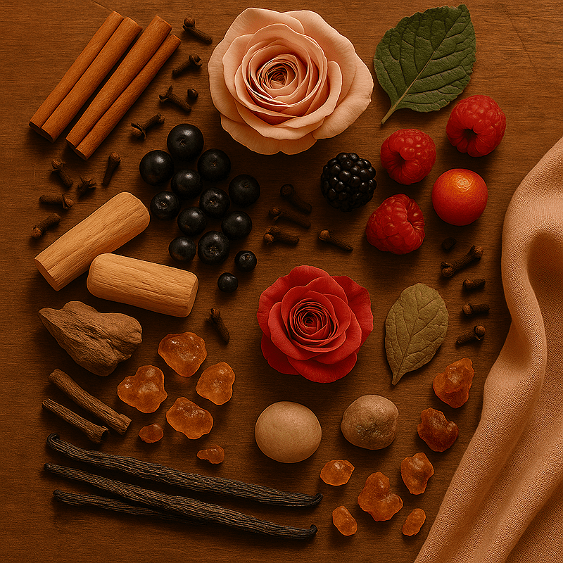 - Κορυφαίες νότες μοσχοκάρφι, κανέλα, τριαντάφυλλο, φραγκοστάφυλο και βατόμουρο
