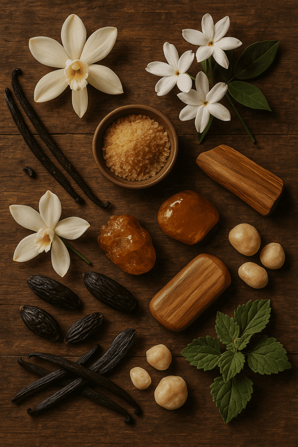 - Νότες Βάσης Κεχριμπάρι, αμπερόξυλο, Μόσχος και πατσουλί