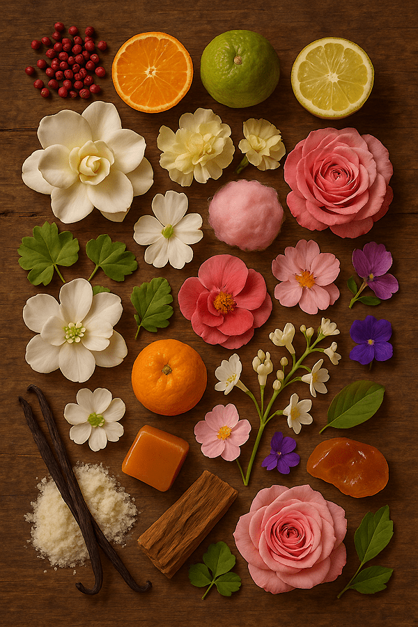 - Μεσαίες νότες γαρδένια, πελαργόνιο, μαλλί της γριάς, λουλούδια, τριαντάφυλλο