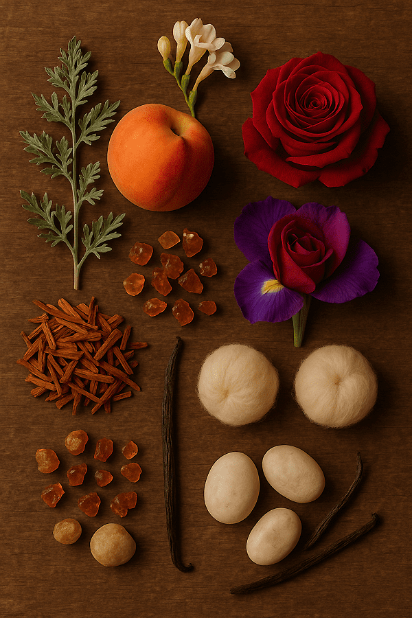 - Νότες Βάσης σανταλόξυλο, κασμίρ, μόσχος, κεχριμπάρι και βανίλια