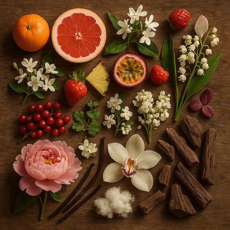 - Κορυφαίες νότες μανταρίνι, γκρέιπ φρουτ, ανανάς, φράουλα και φρούτο του πάθους