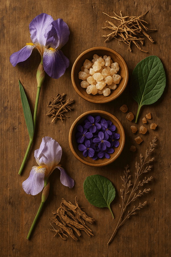 - Κορυφαίες νότες ίριδα και φύλλο βιολέτας
