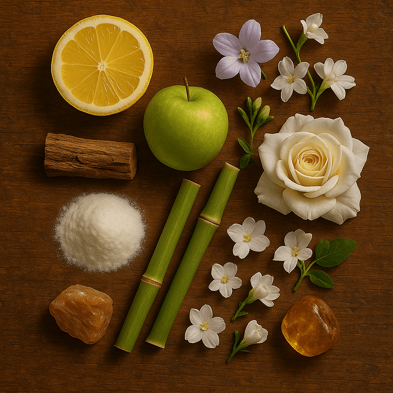 - Μεσαίες νότες Μπαμπού, Μόσχος, καμπάνα, Γιασεμί, λευκό τριαντάφυλλο