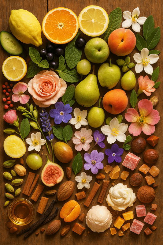 Νότες Βάσης Σύκο, Χουρμάς, Σανδαλόξυλο, Κεχριμπάρι, Κακάο, Σαντιγύ, Ζαχαρωτό, Μαλλί της Γριάς, Σπόρος Τόνκα, Λουκούμι, Φυτικός Μόσχος
