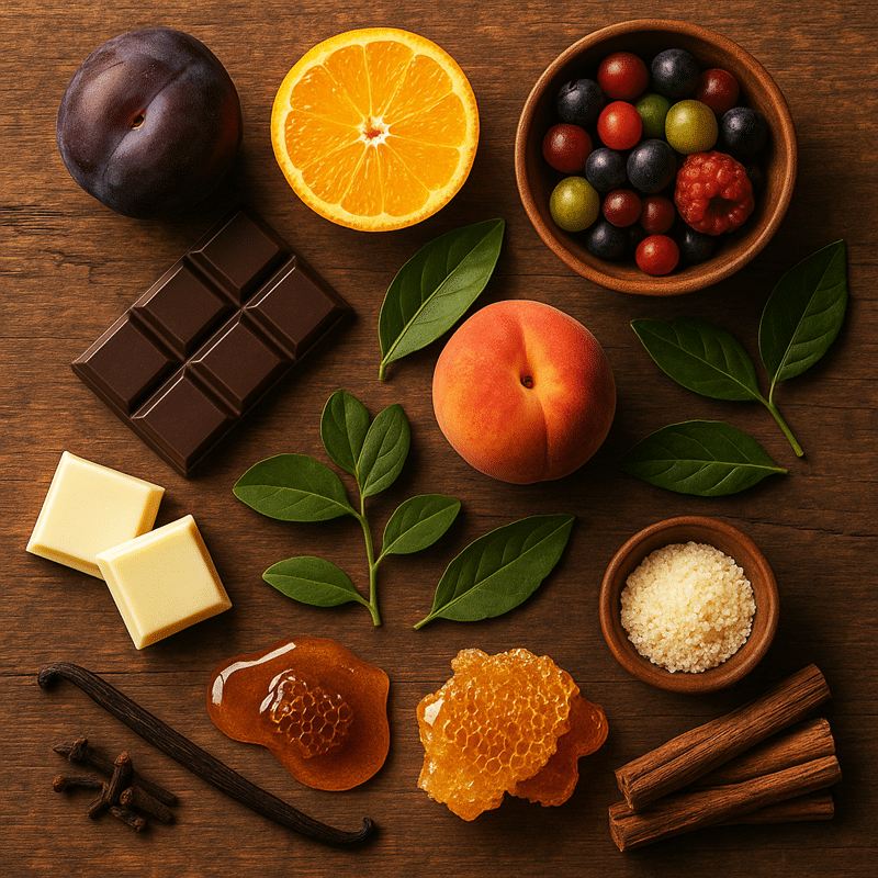 Μεσαίες νότες Νότες φρούτων, Σοκολάτα, ροδάκινο και φύλλο γαρυφαλλιάς