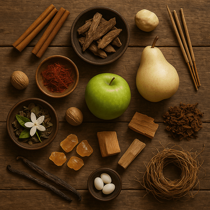 Nότες κορυφής Κανέλα, Ξυλαλόη (Ουντ), θυμίαμα, σαφράν, μοσχοκάρυδο, Πράσινο Μήλο και λευκό αχλάδι
